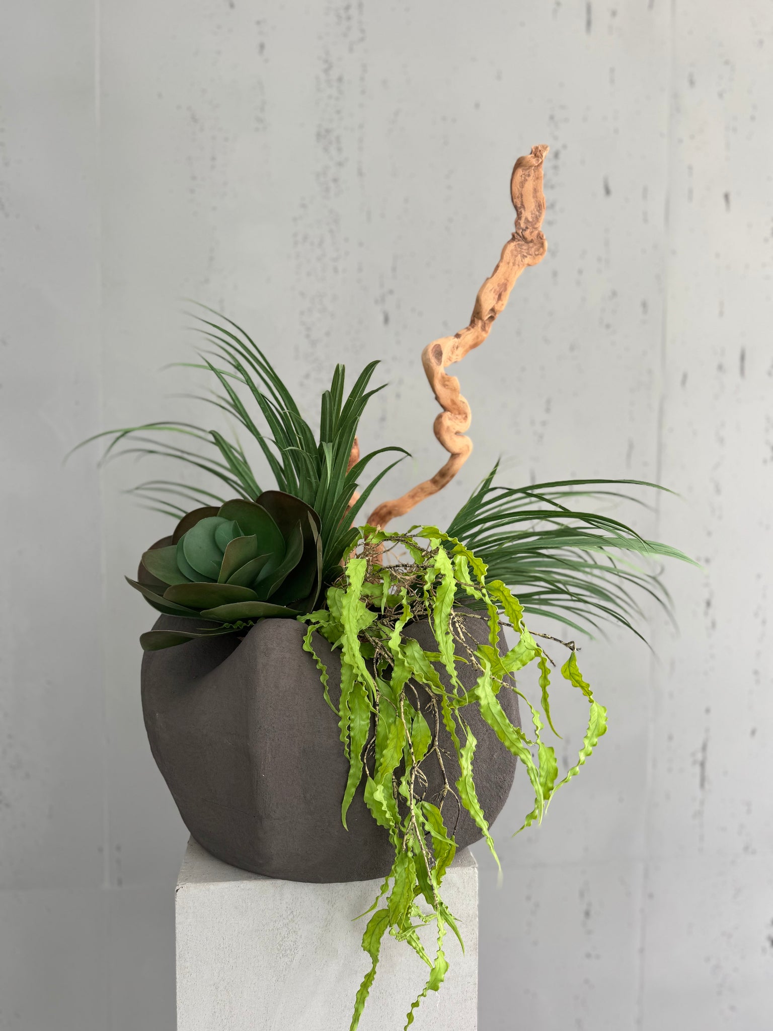 Composition artificielle plus vrai que nature avec un support en béton.